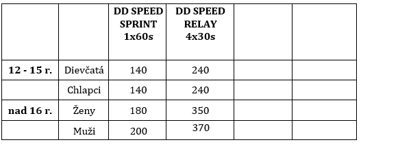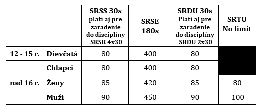 Výkonnostné kritéria v súťažných disciplínach jednotlivcov a tímových súťažných disciplínach SR SPEED RELAY 4×30 a SR DOUBLE UNDERS RELAY 2×30: